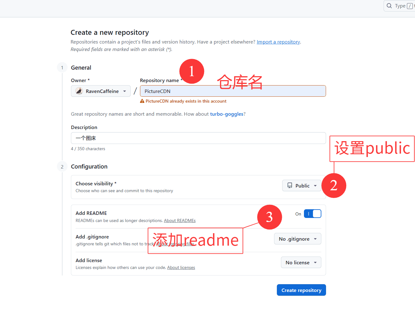 • 设定仓库名,实际上就是用户名+仓库名。这个仓库就是你刚刚在2.1中新建的仓库。