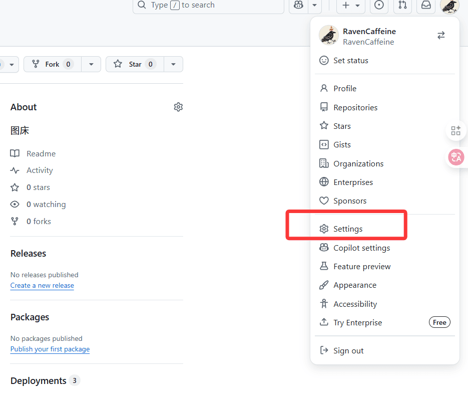 • 进入你的 GitHub 仓库,点击 “Settings”。
