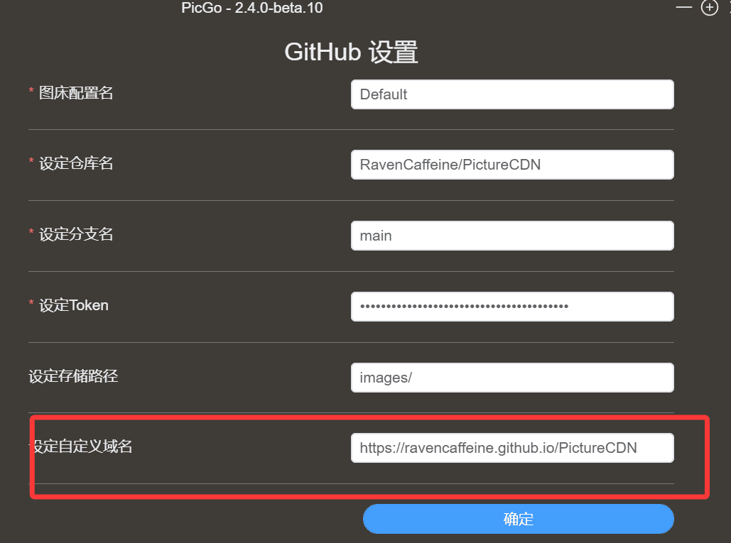 • 返回 PicGo,在 GitHub 图床设置中将 “自定义域名” 设为这个 Pages 链接。