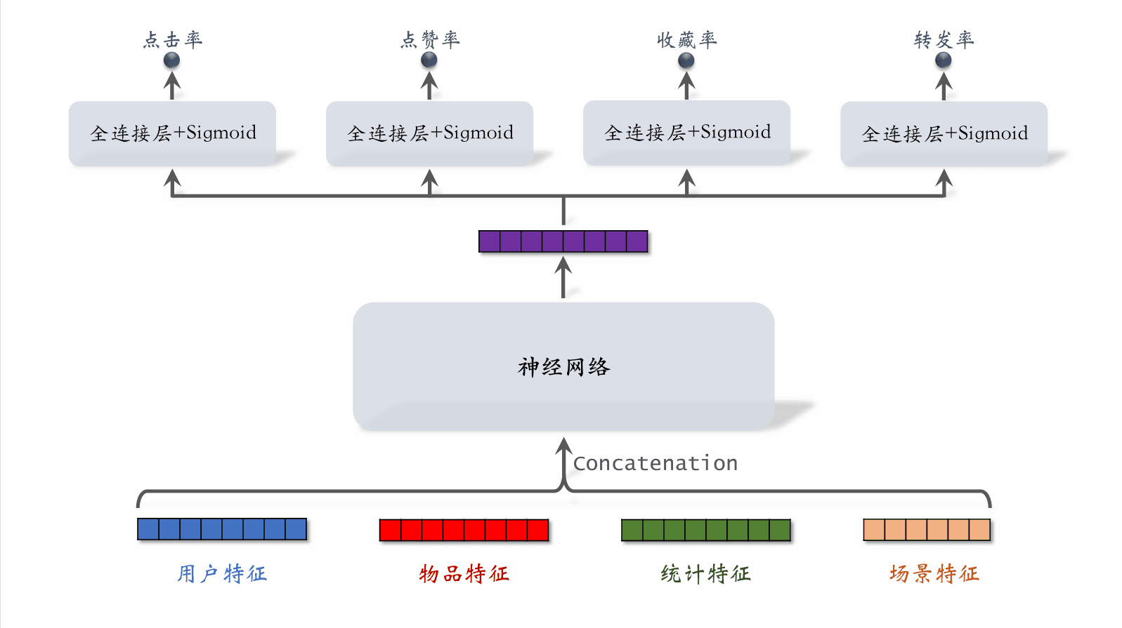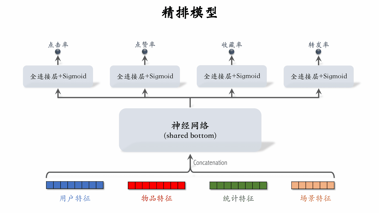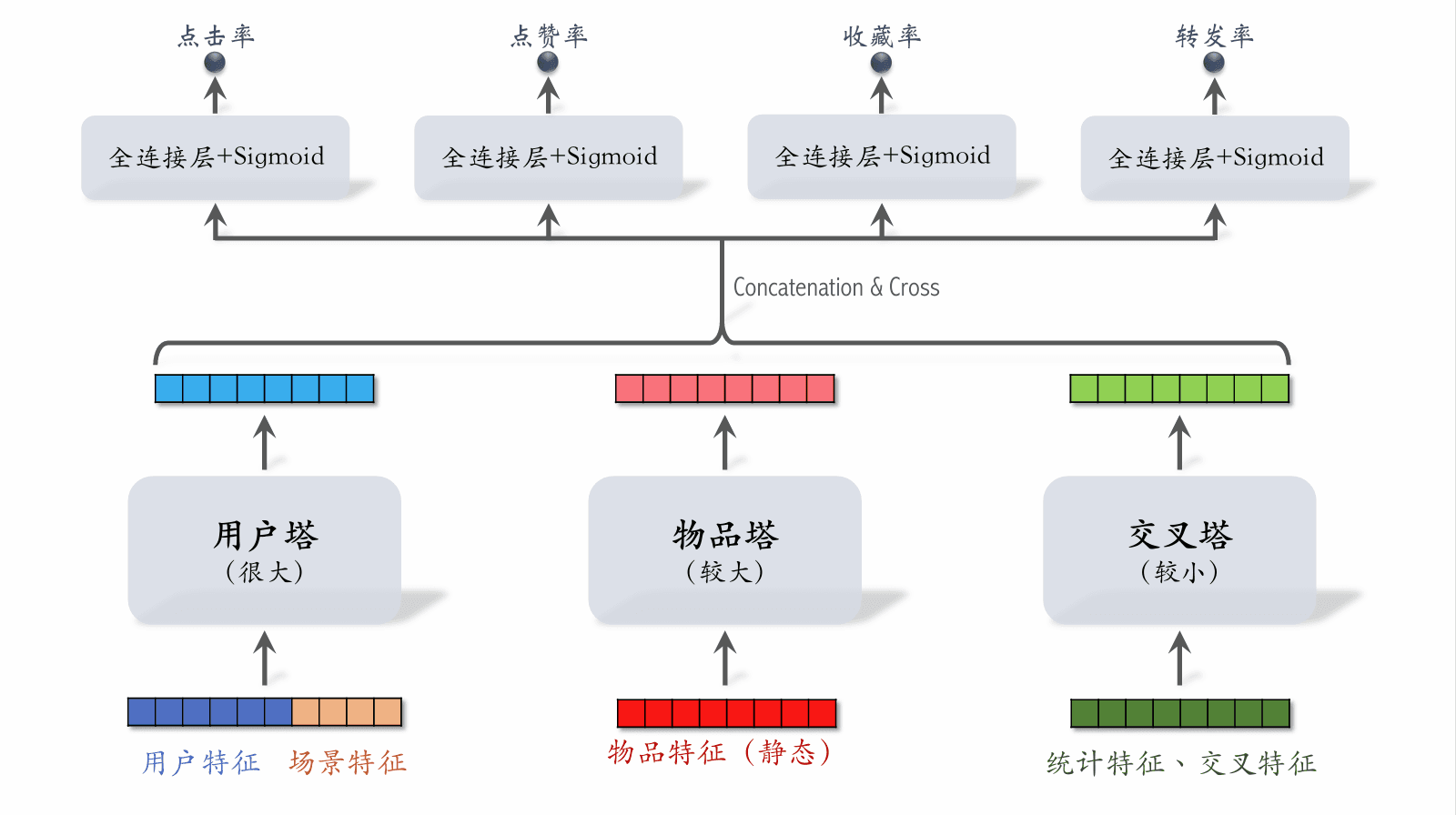 • 排序模型预估点击率、点赞率、收藏率、转发率等多种分数。