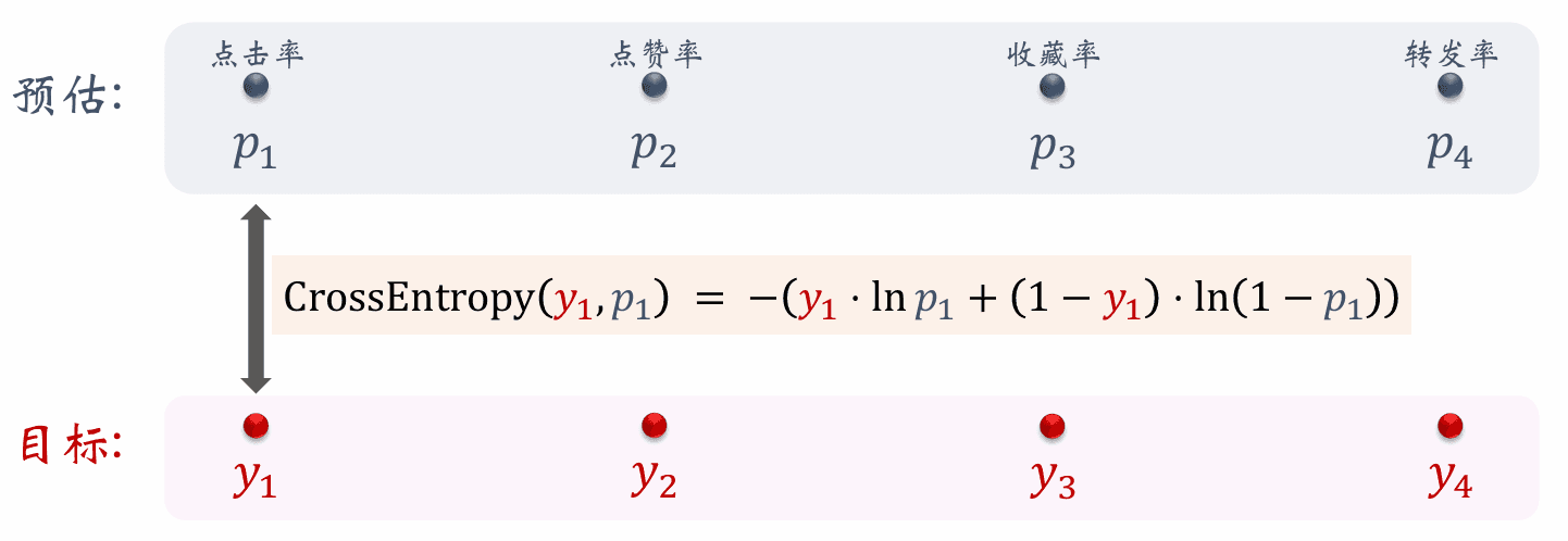 • 对于点击率来说,模型实际上就是根据点击率来判断一个物品是否为被点击物品。这是一个二元分类问题,因此用交叉熵损失函数。