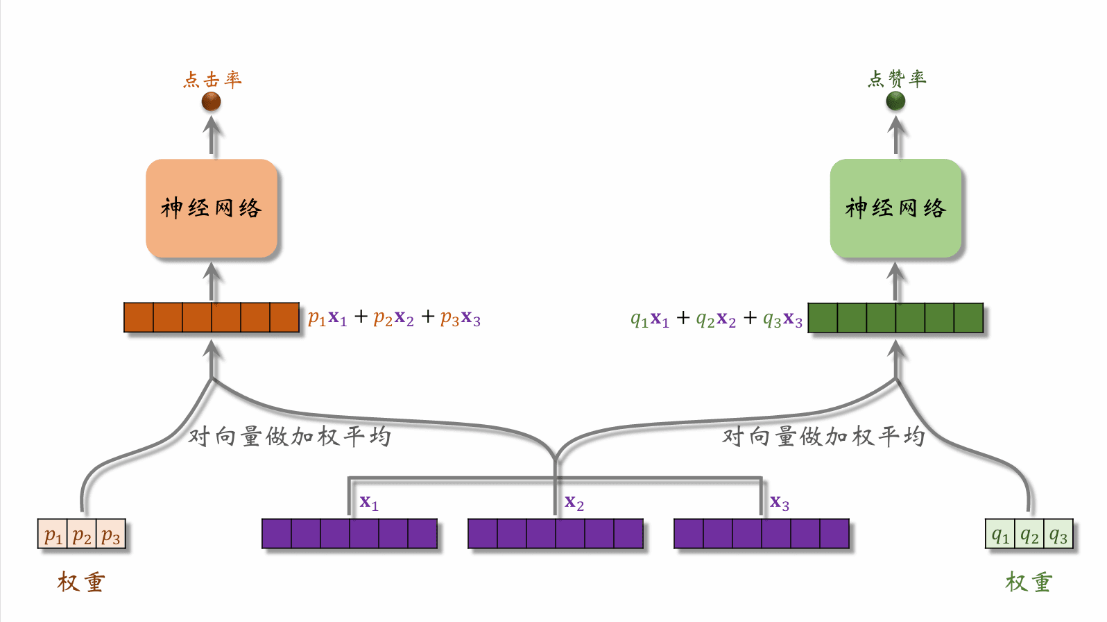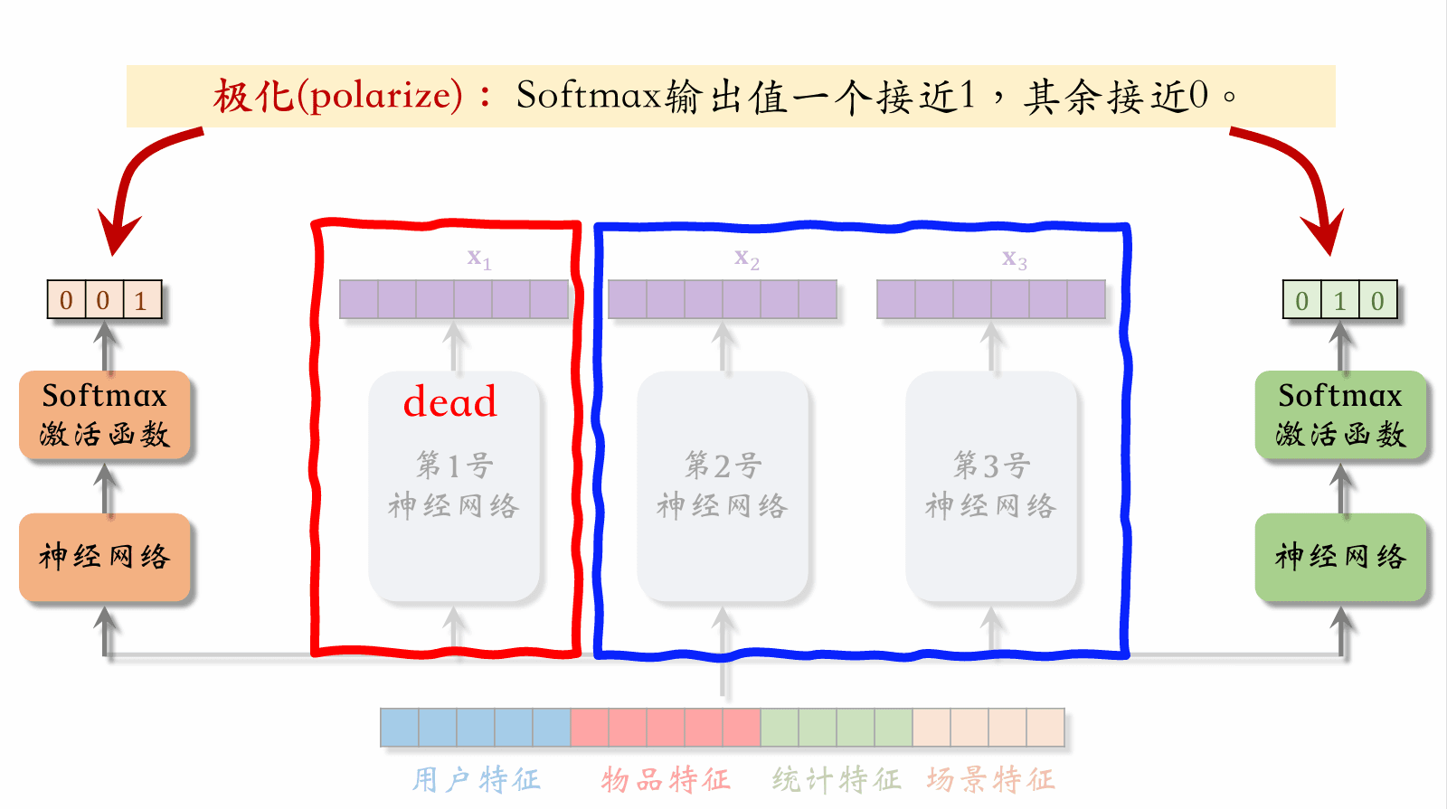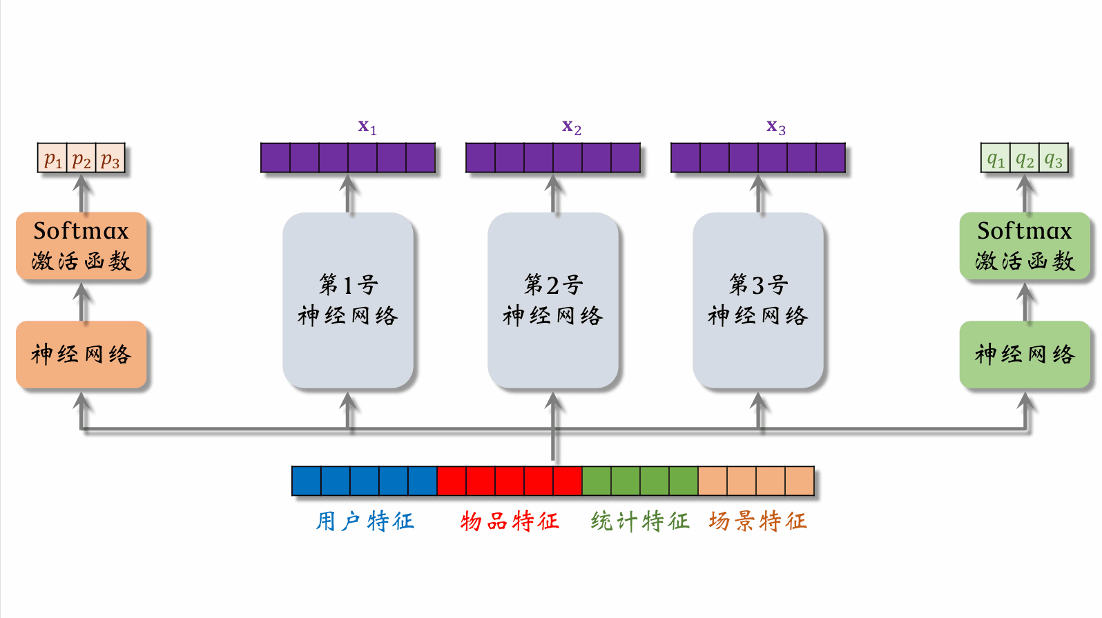 将用户特征,物品特征,统计特征和行为特征输入到左侧的神经网络中,再经过 softmax 激活函数得到一个权重向量,这种神经网络也叫做门控神经网络。向量中的三个值 p1,p2,p3p_1,p_2,p_3 分别代表着对 x1,x2,x3x_1,x_2,x_3 的权重值。右侧神经网络同理。