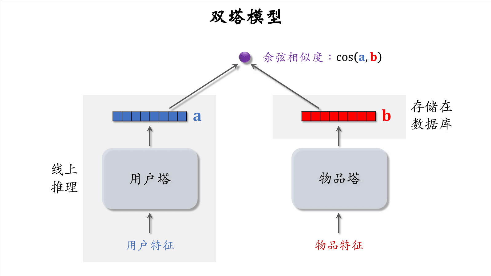 • 物品表征 b 事先储存在向量数据库中,物品塔在线上不做推理。